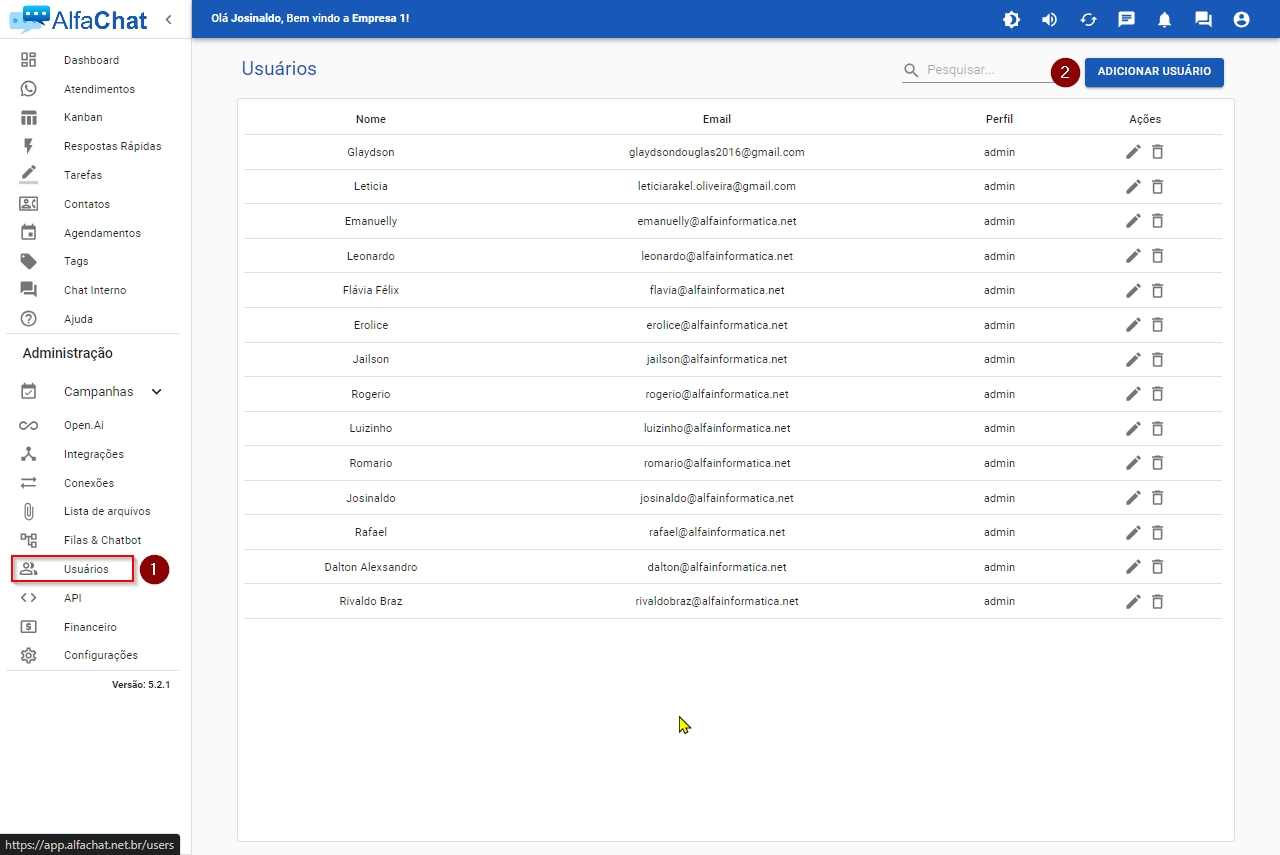 Para começar a usar o chatbot, é necessário a criação de uma conta. Clique na aba 'Usuários' e, em seguida, no botão 'Novo Usuário'.