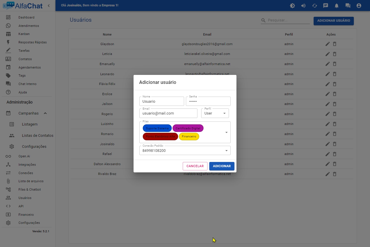 Filas: Selecione as filas de atendimento que este usuário vai poder atender e visualizar.