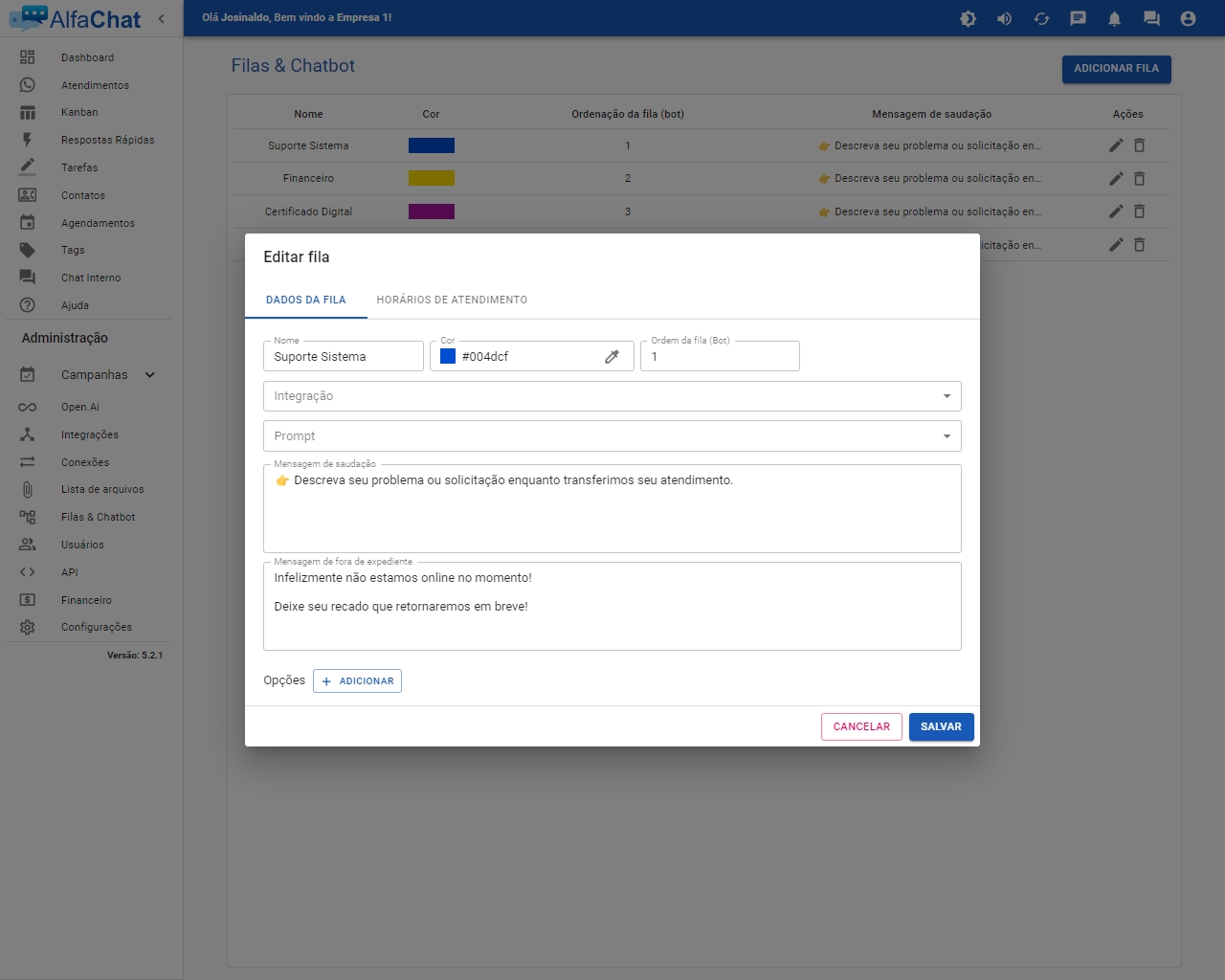 "Olá! Hoje vamos configurar as filas no Alfachat. Imagine as filas como os departamentos da sua empresa. Cada fila representa um assunto específico e o chatbot é o atendente virtual que direciona as conversas para a fila correta. No nosso sistema, o chatbot nativo já vem com essa funcionalidade, ou seja, ele está integrado diretamente às filas. Além disso, você pode conectar outros chatbots, como ChatGPT, N8n, Diaglyflow e Typebot, para expandir ainda mais as capacidades do seu atendimento.