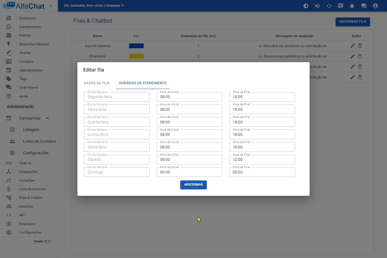 Nesta aba você vai inserir os horários de atendimento de sua empresa em que o chatbot vai direcionar o atendimento para o técnico ou mensagem de inatividade, garantindo que o seu chatbot atenda às necessidades dos seus clientes de forma eficiente.