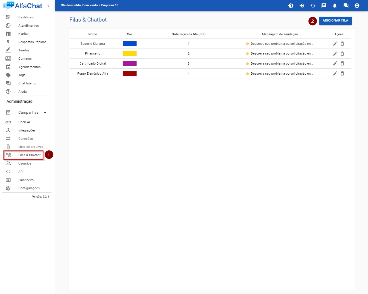 No menu principal, localize a aba intitulada "Filas e Chatbot". Ao encontrá-la, clique sobre ela. Em seguida, procure e clique no botão que diz "Adicionar Fila"