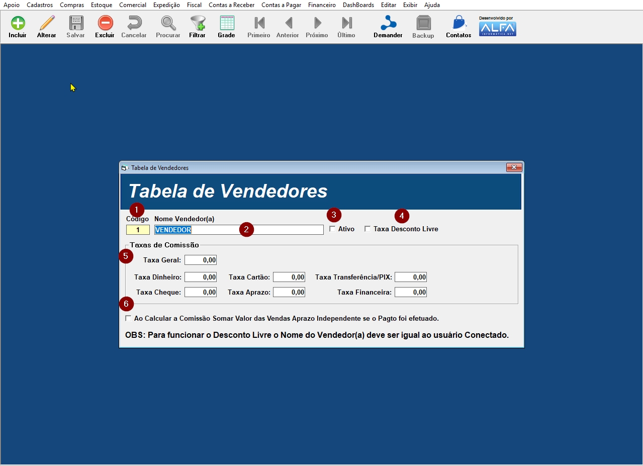 1 - Neste campo serĆ” apresentado o código do vendedor. 2 - Insira o nome do vendedor. 3 - Marque esta opção para ativar o vendedor e permitir sua seleção nas vendas. 4 - Marque esta opção para liberar o vendedor para conceder descontos livres nas vendas. 5 - Insira a porcentagem de comissĆ£o geral ou por forma de pagamento. 6 - Marque esta opção para calcular a comissĆ£o e incluĆ-la nas vendas a prazo, independentemente do pagamento.