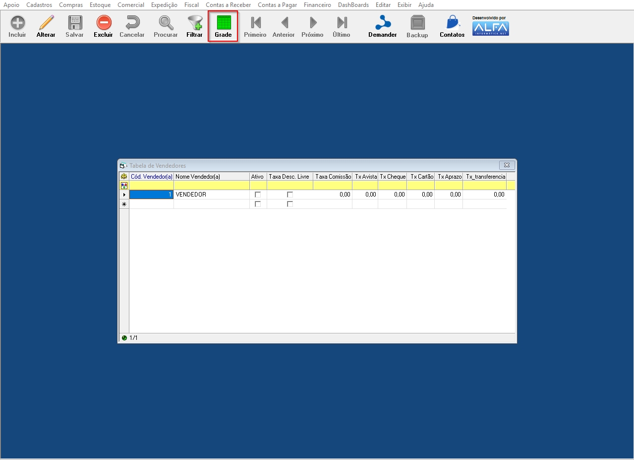 Para consultar o cadastro completo de todos os vendedores, acesse o menu "Grade". Nele, você encontrarÔ uma lista detalhada de todos os vendedores cadastrados no sistema, incluindo as comissões associadas a cada um.