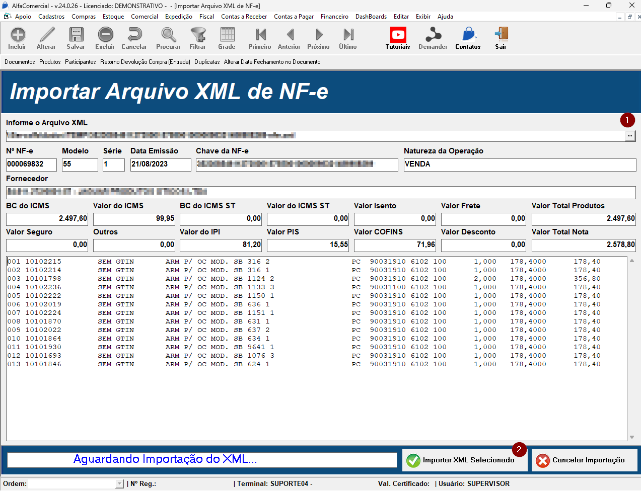 Nessa etapa, se abrirá um modal onde você poderá importar o arquivo XML, enviado pelo seu fornecedor.